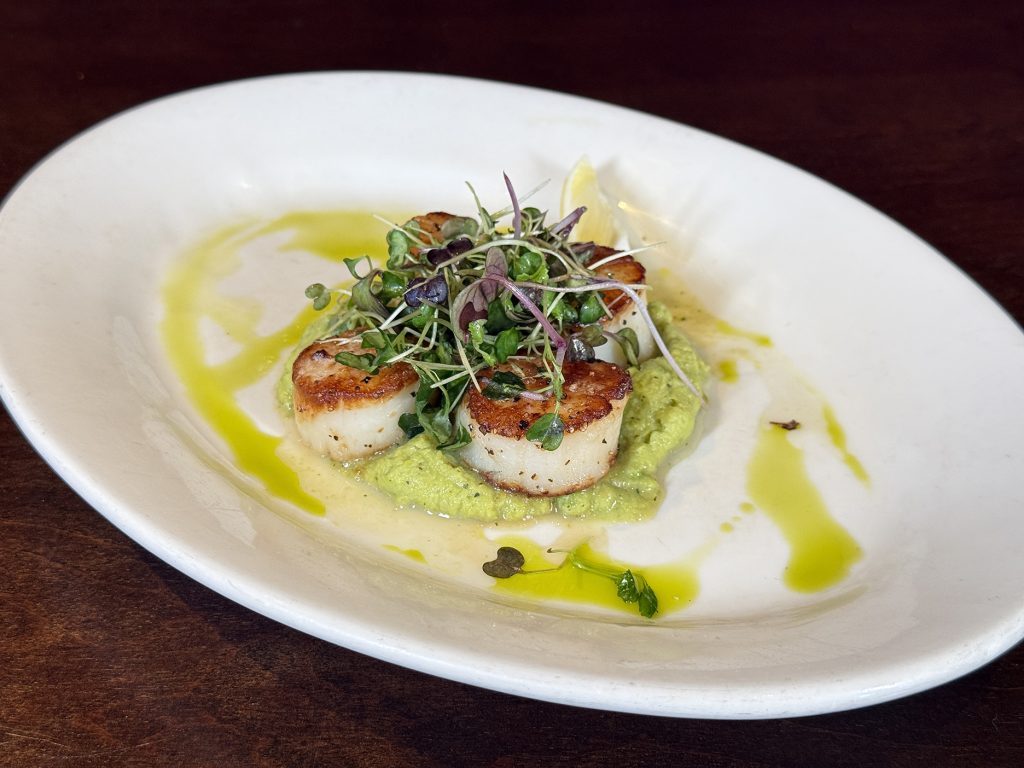 - Pan Seared Scallop with green pea purée and microgreens